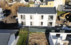 Zakończyliśmy już prace elewacyjne — budynki prezentują się w pełnej formie, a docelowa kolorystyka i wykończenie są w pełni widoczne.