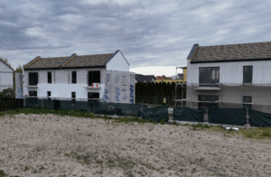 Na początku maja zakończyliśmy ocieplanie czterech z dziesięciu budynków, co pozwala nam rozpocząć przygotowania do dalszych etapów elewacyjnych. Jednocześnie wszystkie budynki zostały zabezpieczone przed opadami atmosferycznymi – wykonaliśmy foliowanie oraz obróbki blacharskie, dbając o ochronę konstrukcji i komfort prowadzenia prac wykończeniowych.