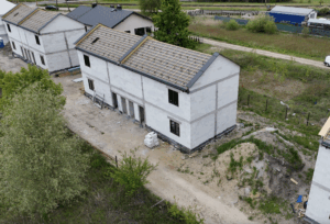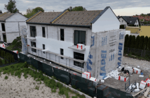 Równolegle prowadzone są prace nad ukończeniem ostatecznego pokrycia dachowego, które wieńczy intensywny etap realizacji więźby i zabezpieczeń. Co więcej, na całej inwestycji została już zamontowana stolarka okienna, co nie tylko poprawia estetykę brył budynków, ale również umożliwia rozpoczęcie dalszych prac wewnętrznych.
